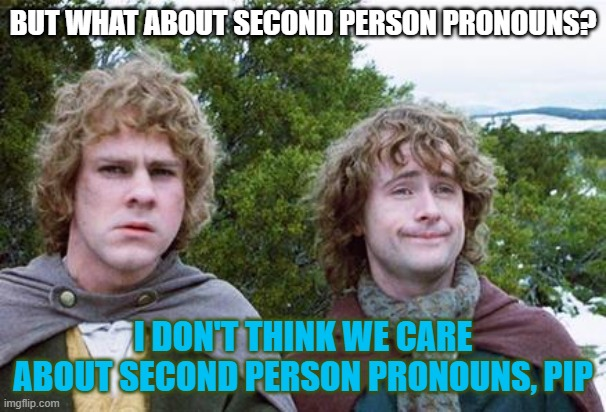 “What about second person pronouns?” you might be wondering. Well, “you” works just fine there in all regards – but I will admit we’re pretty partial to, “y’all” now & then when people slip it in.